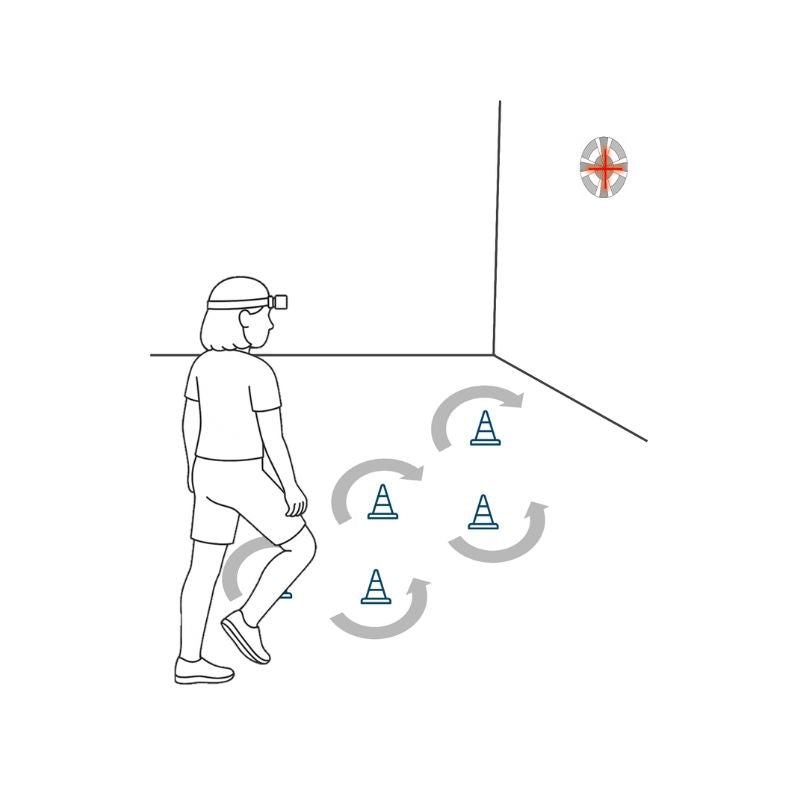 Coloque cinco conos en zigzag en el suelo. Fije la cruz en un objetivo central de la pared justo enfrente.