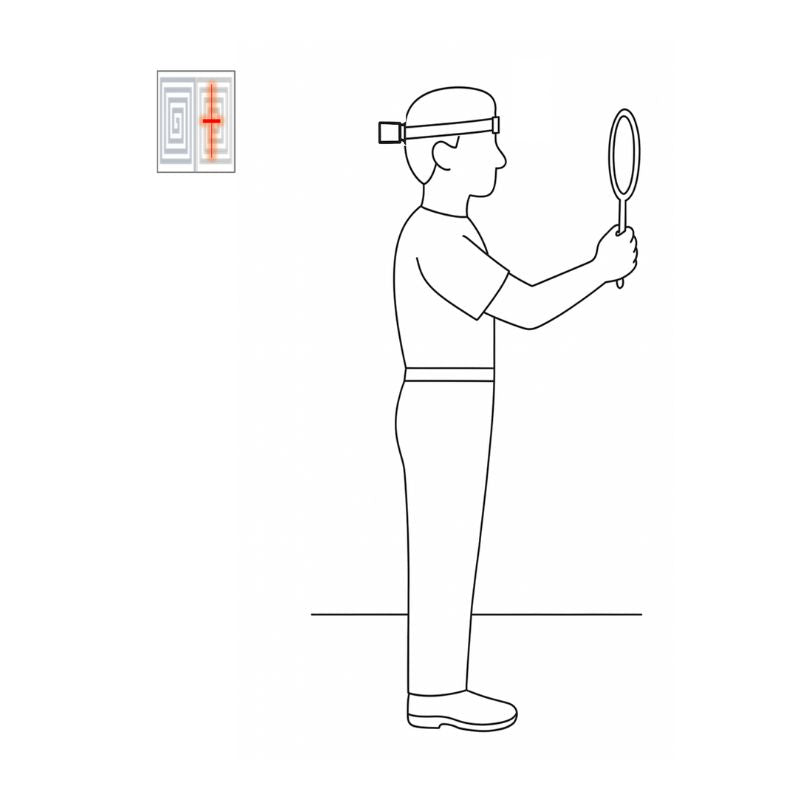 Colócate frente a un espejo y úsalo para guiar la cruz mientras trazas un patrón en espiral colocado detrás de ti en la pared.